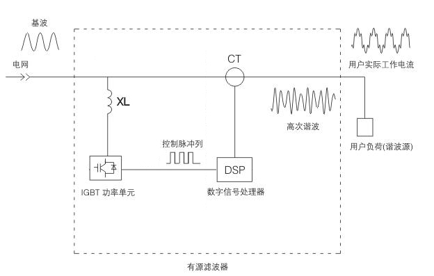 有源濾波器通過CT實(shí)時(shí)檢測(cè)線路電流,并把被檢測(cè)到的諧波轉(zhuǎn)化為數(shù)字信號(hào)處理器中的控制信號(hào)。同時(shí),數(shù)字信號(hào)處理器產(chǎn)生一系列脈寬調(diào)制信號(hào),驅(qū)動(dòng)IGBT功率模塊通過線路電抗器向電網(wǎng)輸出相位正好與電網(wǎng)諧波電流方向相反,而幅值大小相等的電流,兩種諧波電流正好相互抵消,從而達(dá)到濾除諧波、凈化電網(wǎng)電流的目的。
