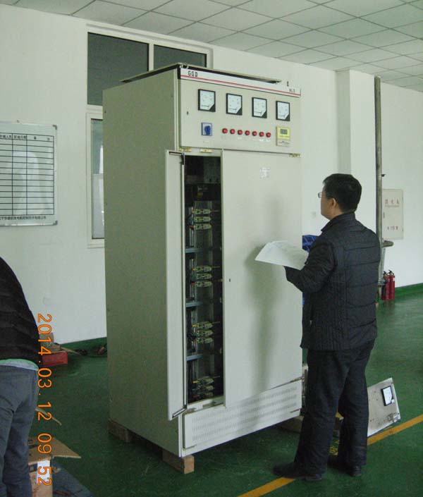 圖四:技術(shù)人員現(xiàn)場(chǎng)展示DETSC低壓動(dòng)態(tài)無(wú)功補(bǔ)償裝置
